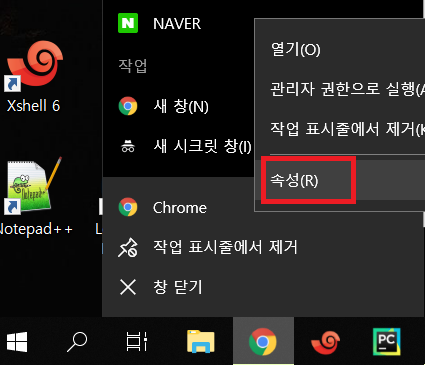 1. 구글 크롬 바로가기 아이콘 오른쪽 마우스 > 속성