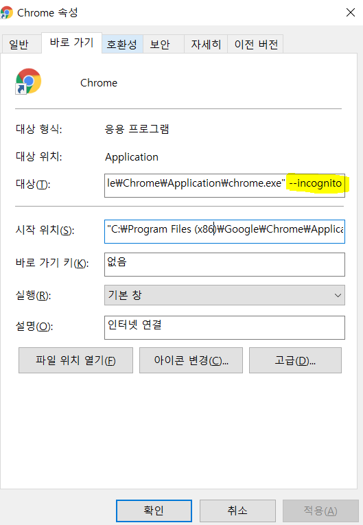 2. 대상에서 가장 마지막 줄에 --incognito 옵션을 넣어주고 확인 클릭하면 끝!